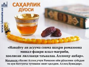“Холис Аллоҳ учун Рамазон ойи рўзасини субҳдан то кун ботгунча тутишни ният қилдим. Аллоҳ Буюкдир!”.
